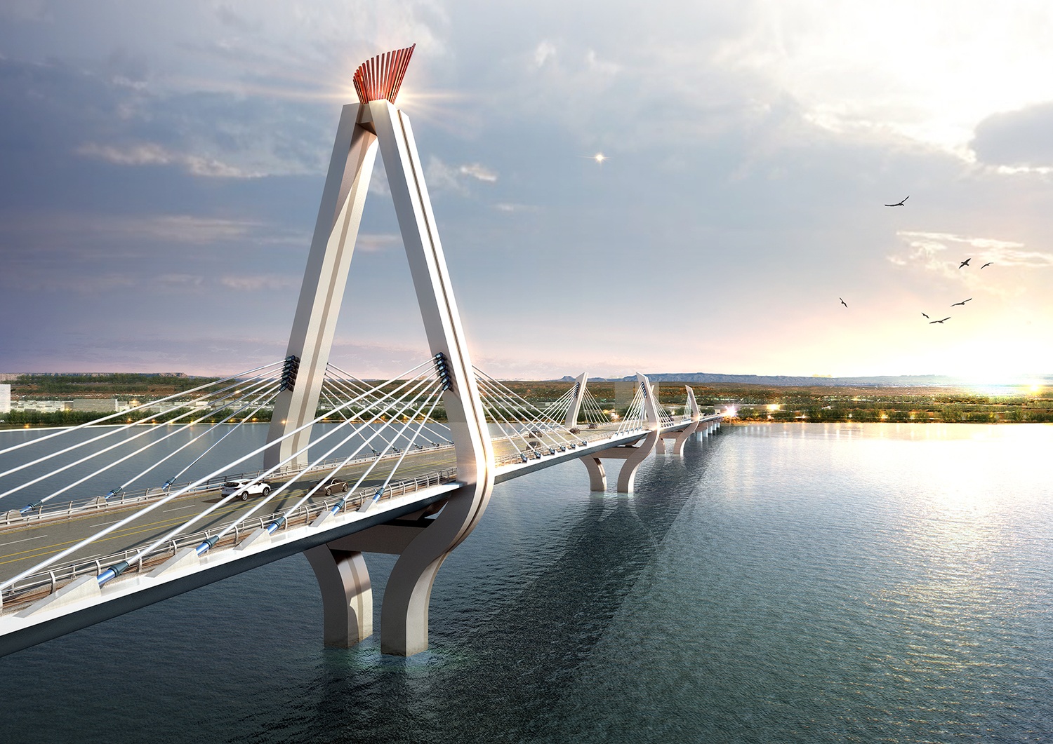 - 교량의 기술과 미학이 조화를 이루는 수려한 미관의 V각 원형주탑 사장교로 계획